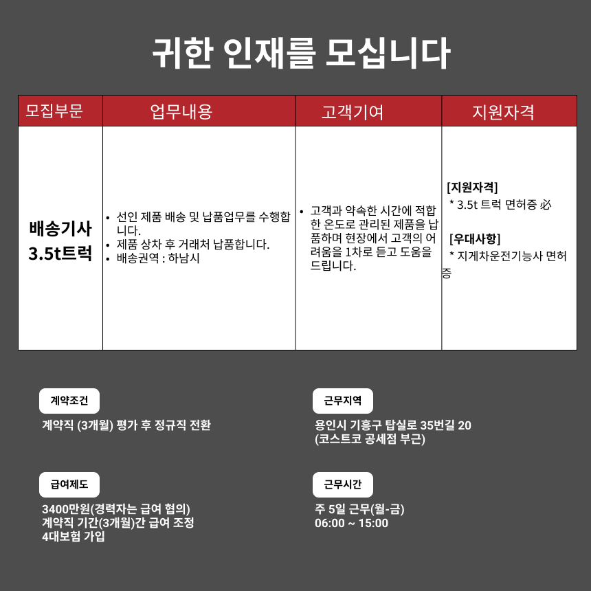 [3.5t 배송] 고객에게 안전한 식품을 제공하기 위해 기여할 인재