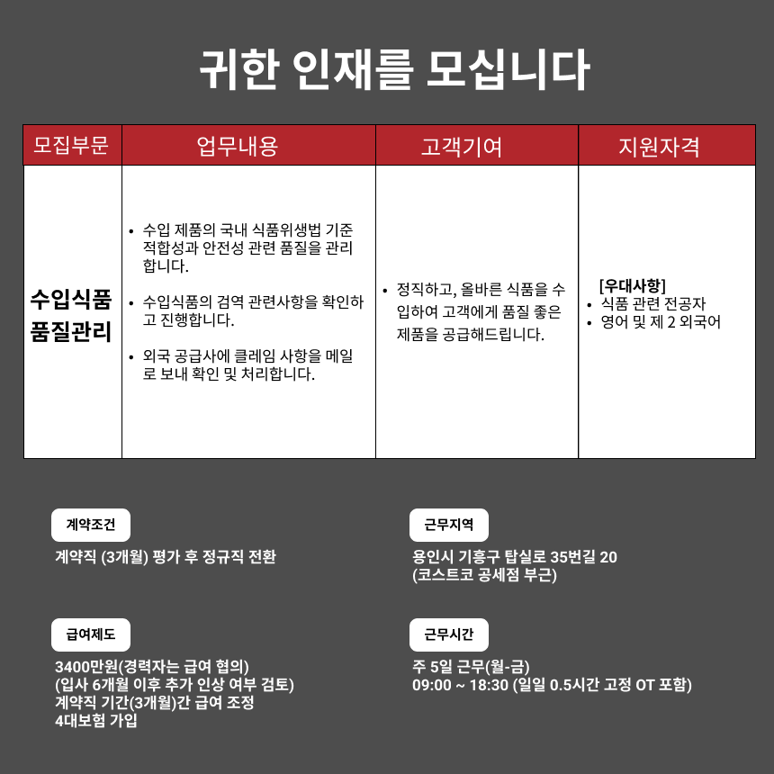 [수입식품 품질관리] 고객에게 안전한 식품을 제공할 인재를 모십니다