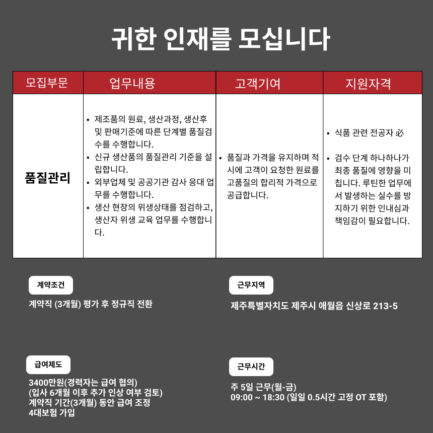 [제주/품질관리]제조공정을 탁월히 관리할 품질관리 팀원 모집합니다